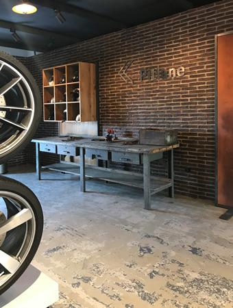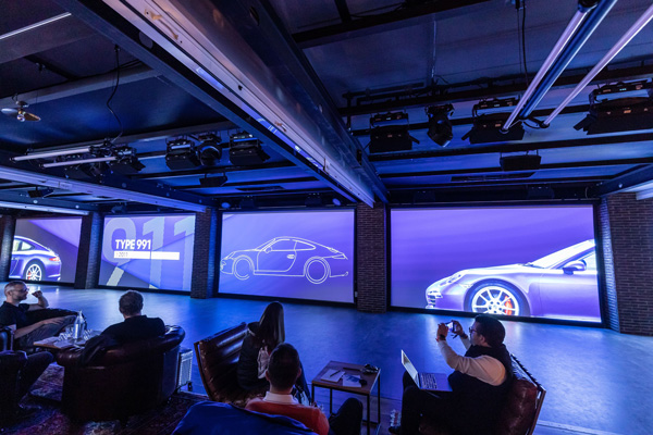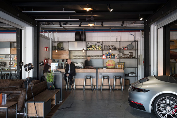 Die Boxengasse einer Rennstrecke wird in eine Werkstattatmosphäre getaucht, die an die Anfänge des Rennsports und die Historie aus 8 Generationen 911er erinnert.
