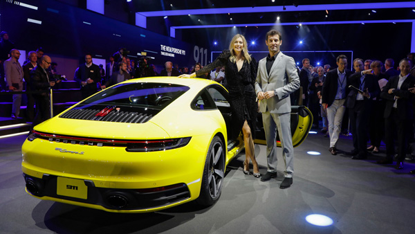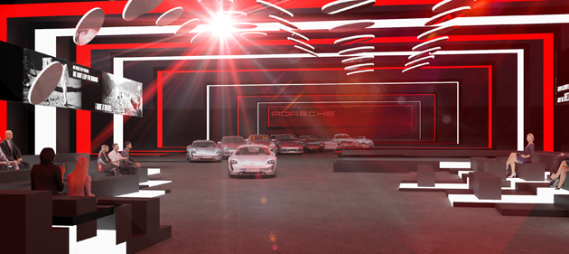 Ferry Porsches eigene Vorstellung von der„ zeitlosen Maschine “ wurde zum Motto, zum Leitprinzip und zum Inhalt der Inszenierung der achten Generation 911. Ein Zeittunnel dient als exklusive Startbühne für eine retrospektive Reise: Von der Vergangenheit kommend und in die Zukunft führend, 250 Meter lang und 25 Meter breit, führte er in der Mitte in einen Würfel. Das Live-Publikum saß rechts und links wie in einer Modenschau. Die Bühne und die Fläche für die fahrdynamische Präsentation glichen einem Laufsteg.