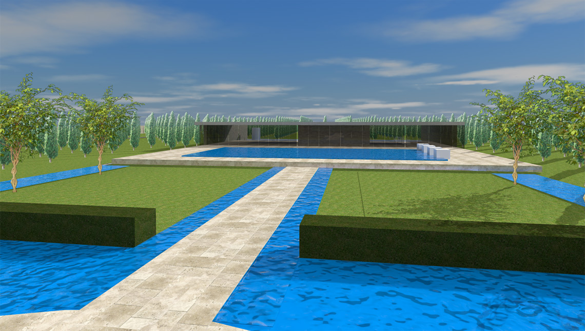 Entwurfsauftrag einer Sportanlage auf 12000 qm mit Indoor Gym, überdachter Freitrainingsfläche und Pool und Gartenanlage.